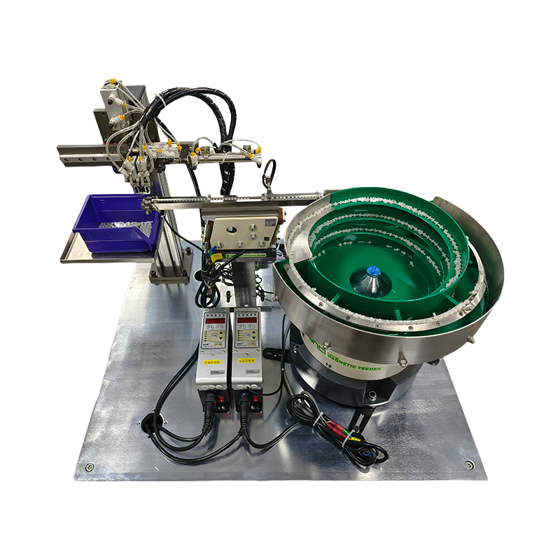 震动盘如何调试和注意事项振动盘是一种自动组装或自动加工机械的辅助送料设备,简称部品送料装置。振动盘工作原理:变频器、电机、实现自动输送作用。它能把各种产品有序地排列出来,配合自动组装设备将产品各个部位组装起来成为完整的一个产品,或者配合自动加工机械完成对工件的加工。 不锈钢振动盘 振动盘料斗下面有个脉冲电磁铁,可以使料斗作垂直方向振动,由倾斜的弹簧片带动料斗绕其垂直轴做扭摆振动。料斗内零件,由于受到这种振动而沿螺旋轨道上升。在上升的过程中经过一系列轨道的筛选或者姿态变化,零件能够按照组装或者加工的要求呈统一状态自动进入组装或者加工位置。其工作目的是通过振动将无序工件自动有序定向排列整齐、准确地输送到下道工序。 一、将电控盒接到220V电压上,如果指示灯不亮,则检查电控盒外侧保险丝位置,保险丝是否完好。 二、将电控盒接到220电压上,调节调速旋转开关,是否按指定方向旋转,观察震动盘的速度,慢慢变快,使震动盘达到贵方要求的速度大于20%以上, 三、震动盘一次性放工件可按盘径大小,如震动盘中工件没有盖住底盘时,马上加料。 四、在震动盘工作中如果出现调速旋转开关旋转到底,工作还是走不动,请立刻停机,查看底盘是否有故障。